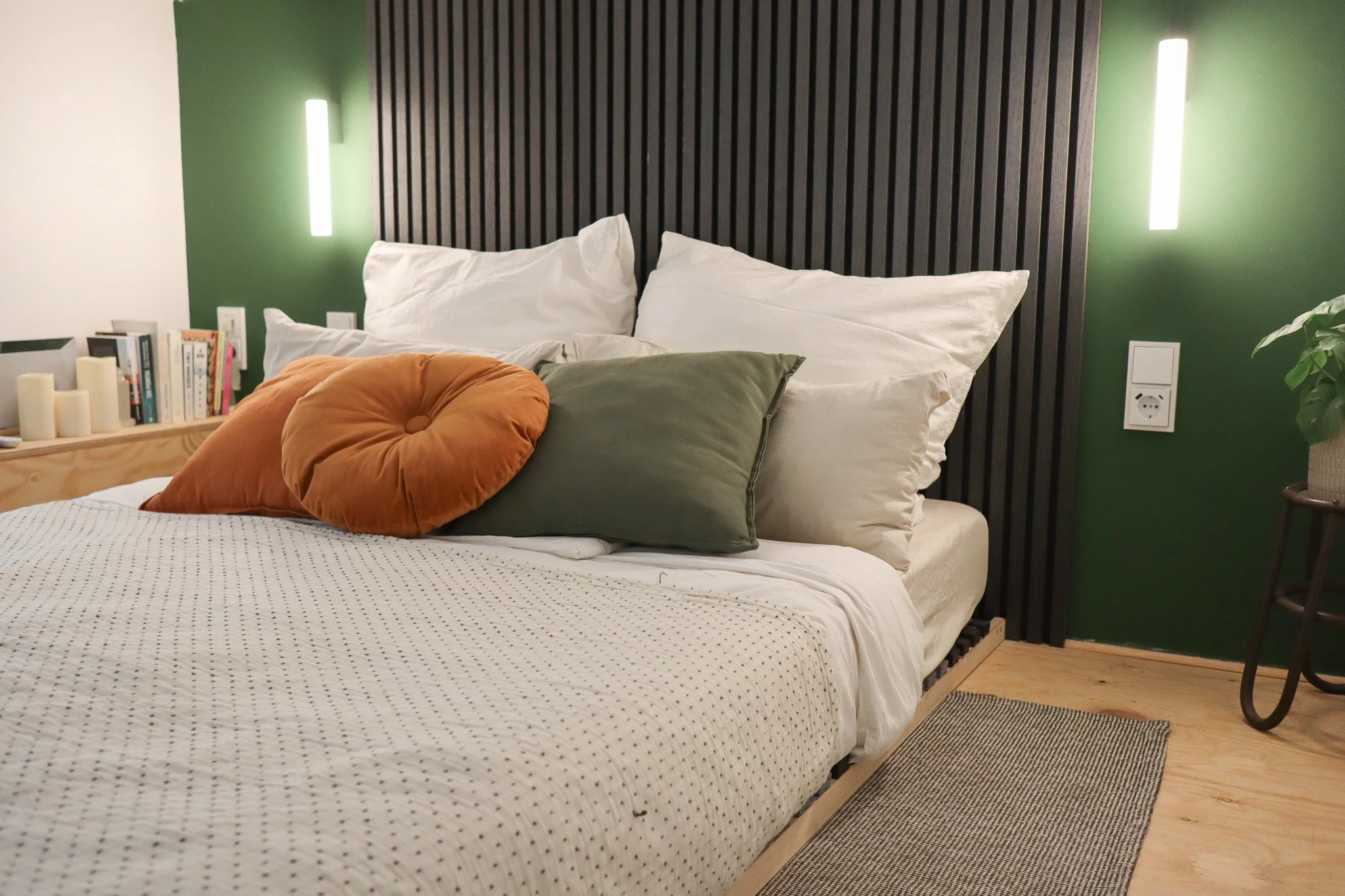 Schlafen Bett 140 cm auf Hochetage mit USB C Steckdosen. Bettwäsche für 2 Personen.